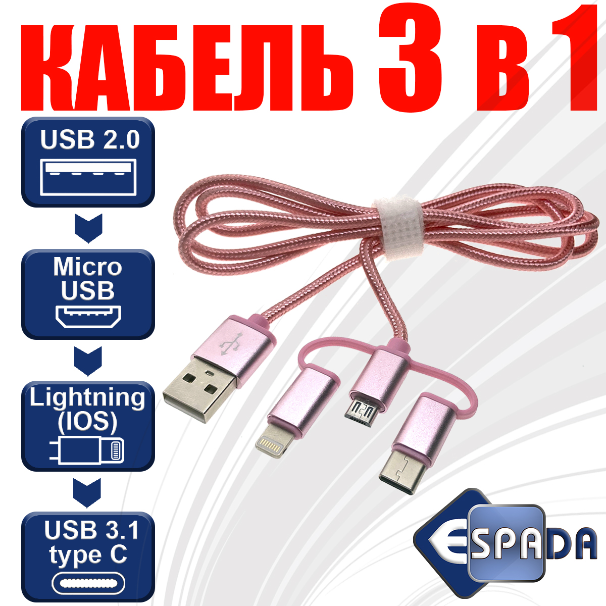 | Каталог » КАБЕЛИ И ПЕРЕХОДНИКИ USB, mini USB, micro USB, type-C » Micro USB » Универсальный кабель - переходник 3в1 USB 2.0 Am to Lightning + microUSB + USB type C 3.1, 1метр, нейлоновая оплетка, цвет розовый. Eusb3in1m-m-p /для передачи данных и зарядки / |
