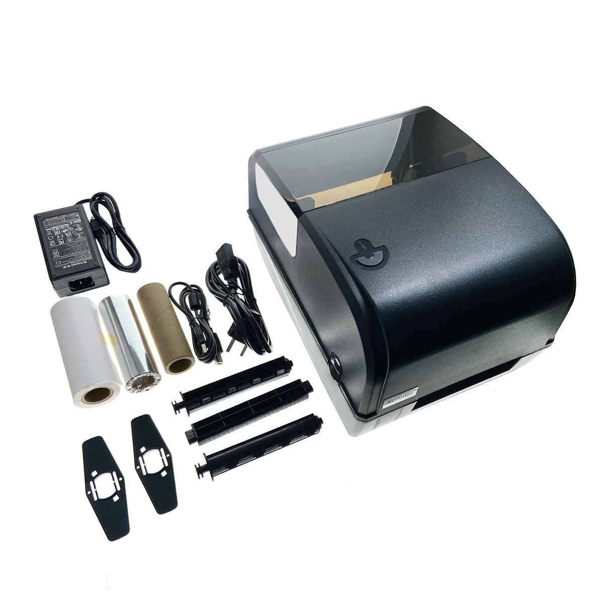 Принтер, блок питания, сетевой шнур, втулка риббона, тестовый риббон, тестовые этикетки, интерфейсный кабель USB, инструкции по настройке и установке, CD-диск с драйверами и ПО